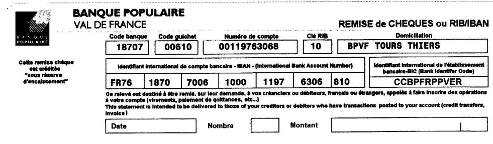 Voici les infos de paiments par chèque ou virement. Comptez environ 10 jours depuis votre envoi. Une fois celui-ci réalisé, merci de m'adresser un mail afin de me prévenir de votre paiement.
